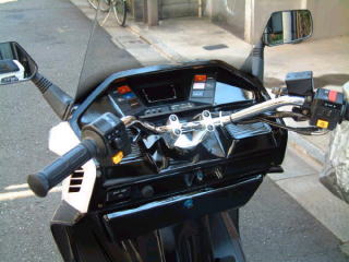 ハンドルも納車時に変更しました。購入前の下見で標準のハンドルは、私の身長ではグリップ位置が高くしっくりこないためです。CFを購入前にWeb上でよくフュージョンのチェックをしており、みなさんハンドリングに不満があるような報告が多いので心配していたのに反し、私自身は全く問題なくニュートラルで非常に乗りやすいとの第一印象です。ワダチや左端の荒れた路面の走行時のハンドル取られも全く気にならないレベルです。コーナリングに関してもこの手のバイクは、リーンウィズが基本と思いますがリーンアウトでもハングオンでもOKですね。ハングオンの時は、パッセンジャーステップを活用しますが、多分はたから見るとカッコ悪いと思うので極力人の見ていないところでやるようにしています(?)いずれにしても重心移動という基本動作を確実かつ慎重に実施してやればかなりの速度でコーナをクリアし、結構侮れないと思いました。ただし、荒れたコーナーではリアサスの踏ん張りが少し足りない感じでタイヤの剛性の方が勝っているようですね。リアサスも行く行く変えたいと思っています。乗り始めに気になったのは、ブレーキの効きです。新車で当りが出ていないのか、初期制動時の食いつきがイマイチといった感じ。それなりの力を掛ければ、タイヤを鳴かせながら(もちろんロックはさせません)の制動は出来ますが・・・・・。これは、距離が進むまでもう少し様子を見てます。