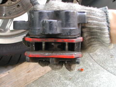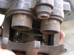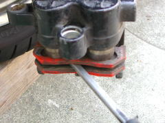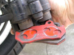 ドライバーなどをパッドの間でレバーにしてピストンを押し戻す。マスターからのフルード漏れに注意。こぼれたらすぐ水で流してください