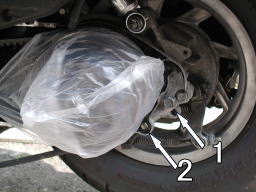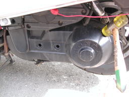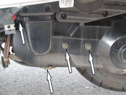 オイルを排出する前に、クラッチやドライブベルトにオイルが付着しないように、ビニール袋などでカバーします。 排出したオイルの受け皿をドレンボルトの下に設置します。 |