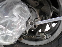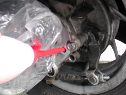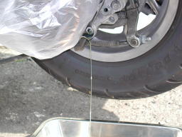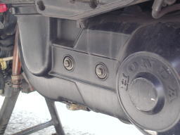 12mmのソケットレンチでチェックボルトを外し、10mmのソケットレンチでドレンボルトを外すと、ミッションオイルが出ます。 車体を左へ傾けるとより多く排出できます。外したボルトは、汚れがつかないように保管します。 |