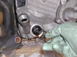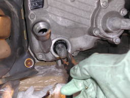 ボルトを落下させないように外します。古いオイルが勢い良く流れ出します。 |