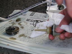 古いオイルが抜け切るのを待つ間に、外した部品を、パーツクリーナーなどで掃除しておきましょう。 |