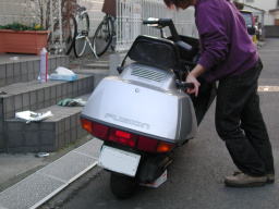 こだわるひとは、一時的にセンタースタンドを外し、車体を左右に傾けてもいいでしょう。 特に右へ傾けると、垂直の時には抜けないオイルが出てきます。 |