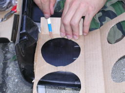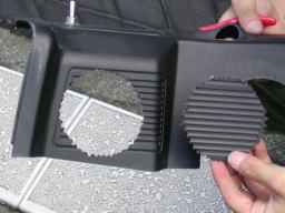 切り口をカッターナイフやヤスリなどで整え、サイズを調整します。切り口が多少粗くてもスピーカーを載せれば見えなくなります。それよりも、穴を拡げすぎたり表面に傷をつけないように注意します。 |