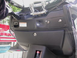 メンテナンスカバーを取り付けます。スピーカーケーブルやロータリーコマンダーのケーブルを、カバーの合わせ目に挟まないよう注意します。ハンドルを左右いっぱいに切った際に、違和感が無ければOKです。 |