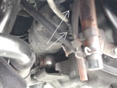 矢印のモーター固定ボルト2本を外します。供締めされたグランド側の端子が同時に外れます。 |