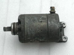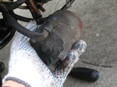 セルモーターを少しずつ揺らしながら車体左側へ引き、エンジンから抜き取ります。 |
