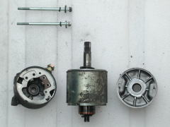 軸と平行に貫通しているロングボルトを2本外して、前後のカバーを外します。 |