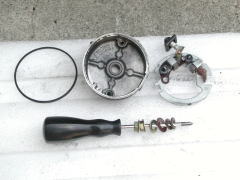 外側のカバーを、リング、カバー、ブラシホルダーの3点に分解します。 |